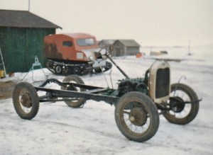 π» 1950’s – Background is the Red Snow mobile built by Austin, foreground is the chassis for the 1929 Model “A”